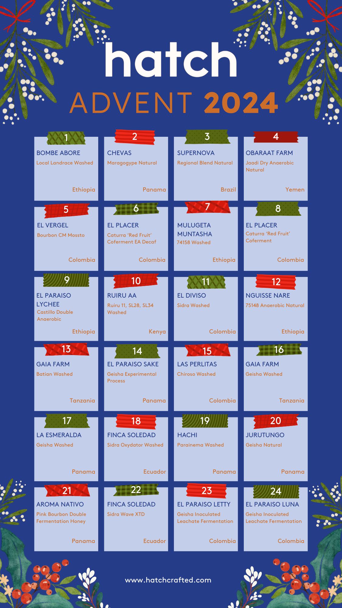 As a note, the roasting of the coffees for the advent calendar were done on the last week of October and first week of November. The roasting order does not necessarily match the order that the coffees are placed in the calendar. Our head of coffee specifically chose certain coffees to roast first or later based on how they will age and keeping in mind that people will brew them in order starting on Dec. 1