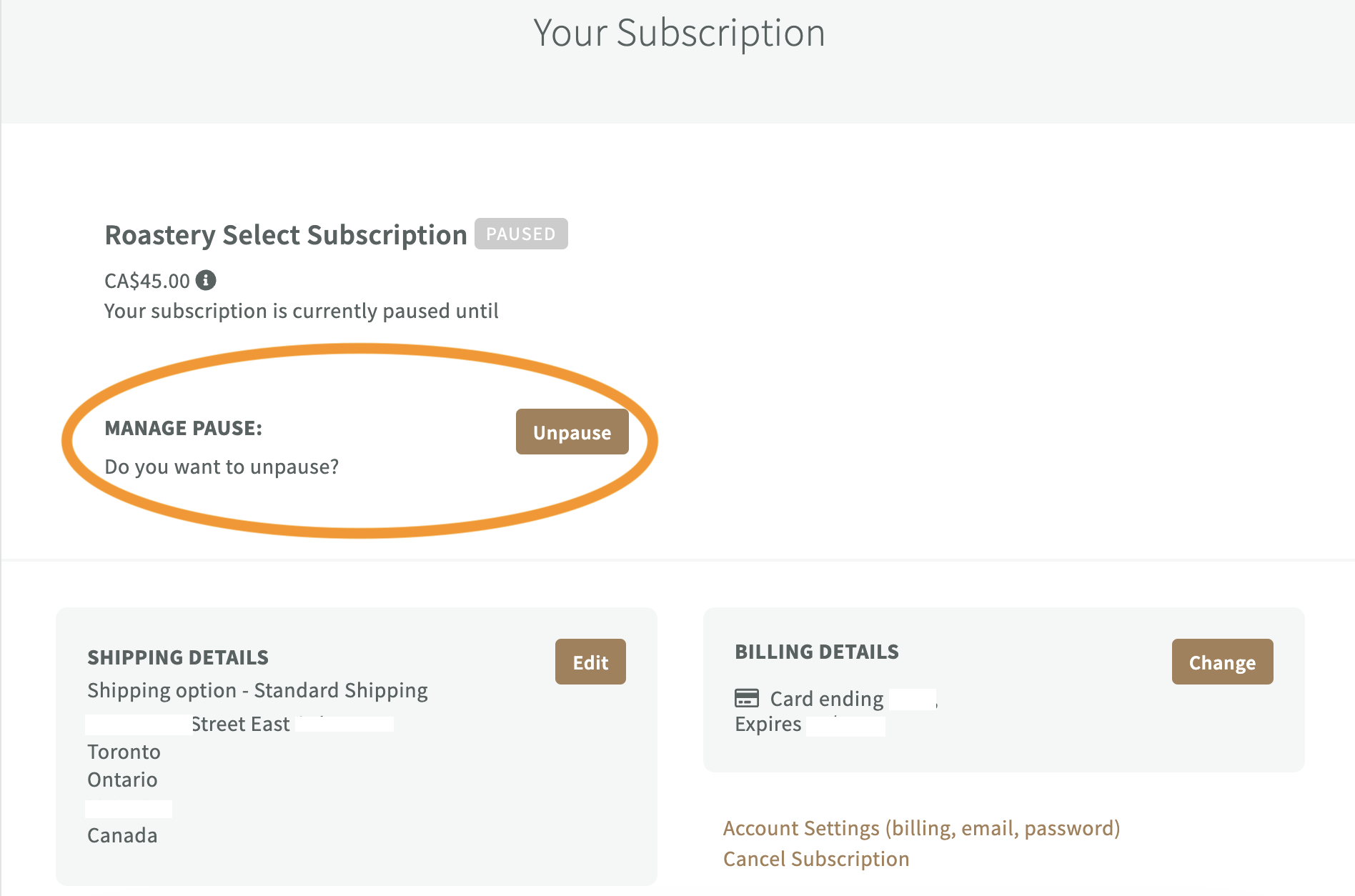 You will be able to pause or skip your subscription as needed and you will be able to make changes to your delivery address and payment here: